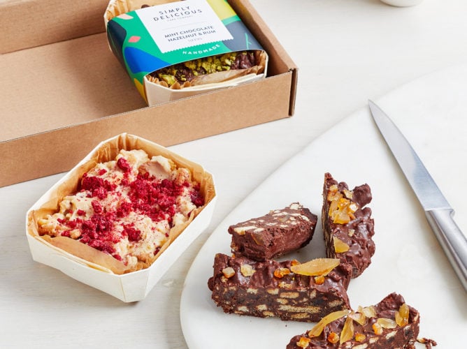 The temptation comes in three ways in ONE box: Mint Chocolate Hazelnut & Rum, White Chocolate & Raspberry and then Chocolate Orange & Ginger. No need to keep them in the fridge (unless there is a heatwave). Cut with a sharp knife and then find a quiet spot away from the busy rush of life.